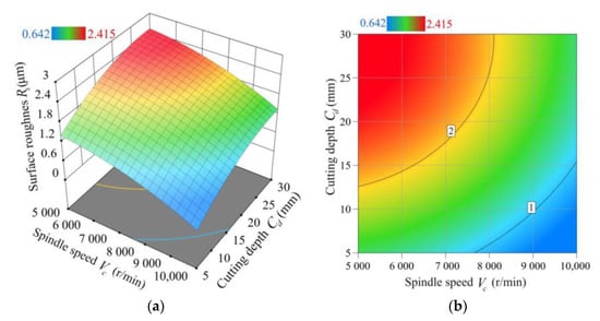 The response surface model can visually reflect the influence law of the parameter changes of the interaction term on the surface roughness. Figure 5 shows the response surface model of the interaction term spindle speed Vc and cutting depth Cd. It can be concluded in Figure 5a,b that when the feed speed Vf is 17.5 m/min, the surface roughness of the wood gradually increases as the spindle speed Vc decreases and the depth of cut Cd increases, and the results are consistent with the conclusions reached by the authors of the literature [25,32]. On the contrary, if the spindle speed Vc increases and the depth of cut Cd decreases, the surface roughness of the wood gradually decreases.