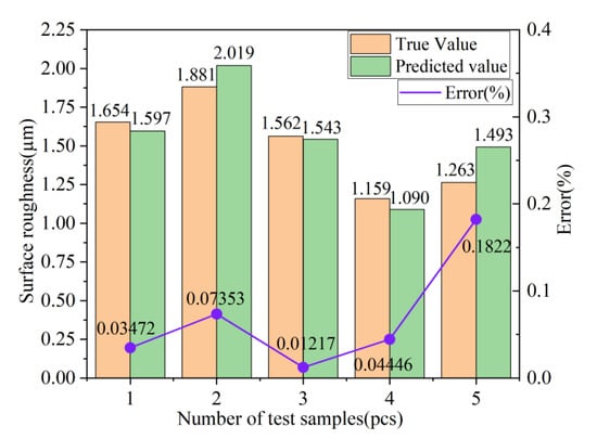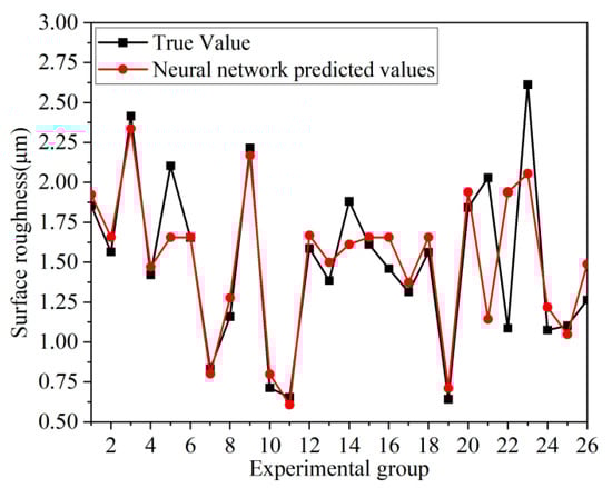 Figure 9 shows the predicted values of the ANN model for all samples compared to the true value results, using MSE, MAPE, and R2 to evaluate the performance of the ANN model. Demir A et al. pointed out that MAPE is one of the important evaluation criteria, and the performance of ANN models is high when its value is less than 0.1 [33], and Tiryaki S, in using MSE to evaluate the model, determined the performance of the network [25]. All samples in the paper had MSE values of 0.025, MAPE values of 0.01, and coefficient of determination R2 values of 0.95 in the predictions. These error levels are small, the ANN model has a small fitting error, and the ANN model can be used to predict the effect of chip size on surface roughness.
