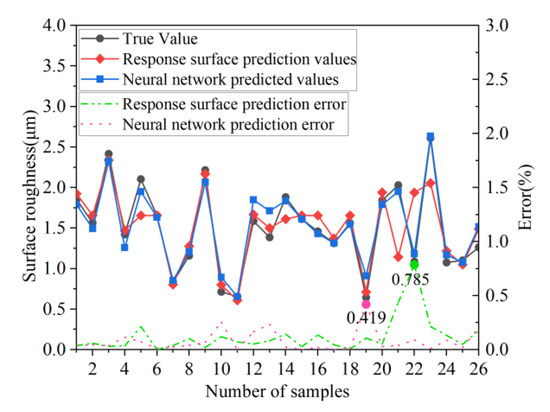 The true values of 26 sets of trials with ANN model predictions and response surface predictions and errors are given in Figure 10. The figure shows that the error of the predicted values of groups 21 and 22 in the response surface model is 43.6% and 78.5%, while groups 21 and 22 are supplementary experiments, it can be concluded that the prediction accuracy of the response surface for supplementary experiments is not high, but the average error of the predicted values of the response surface is 12.2%, which is a relatively good result. The maximum error in the ANN model prediction was 41.9%, and this condition was caused by the error in chip size measurement. The average error in the ANN model prediction was 7.8%, which was smaller than the average error in the response surface prediction. The figure also shows that overall, the line graph of the predicted values of the ANN model is closer to the real values, which again validates that the ANN model can be used to analyze the effect of chip size on surface roughness.