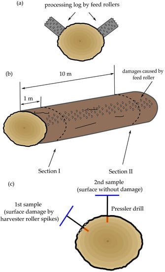 This study was conducted in two stands located at logging plots in western Poland (GPS coordinates N: 52°40′29″; E: 16°47′29″). The stands were predominantly populated by Scots pine (Pinus sylvestris L.) and have similar ages (89 and 94 years old). The two stands are located in regions with similar edaphic conditions corresponding to a fresh coniferous forest growing on podzolic soil. The average diameter at breast height in both the parcels was 30 cm, with an average tree height of about 25 m. The study was conducted on randomly selected logged pine stems obtained via clear-cutting interventions carried out in the two cutting blocks. In total, 45 logs were selected. All the trees were cut by two harvesters: PONSSE Ergo (Ponsse, Vieremä, Finland) and Timberjack 1270D (H. Serup Olesen A/S, Brande, Danmark). The head of PONSEE—H7 was equipped with 3-feed-roller system with a 30 kN feed force and 5 m/s maximum feeding speed. The maximum cutting diameter for this head is 640 mm. The second harvesters’ head—HD 758—was equipped with 4 feed rollers with a feed force of up to 30 kN and a feeding speed of up to 5 m/s. The maximum cutting diameter of the head was 720 mm.
