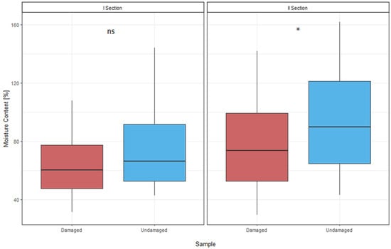 Distribution of moisture content in the sections of large-sized wood assortment examined, which have been arranged by wood type. The significance of the differences is marked * for p value < 0.05, and ns for no significant differences according to the results of the Mann–Whitney U Test. Whiskers correspond to minimum and maximum values, boxes represent the 1st and 3rd quartile values, and midlines indicate the median.