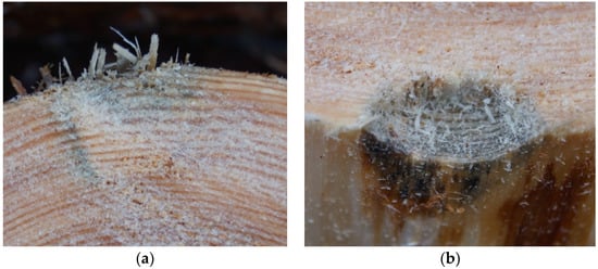 Differences in moisture content have no influence during processing. On the other hand, they may cause discoloration, such as that engendered by blue stain. It has been proven that in places where damage occurs, a breeding ground for blue stain is created [,]. The problem of the faster occurrence of blue stain in timber harvested by harvesters has been recognized. However, it is not clear why this happens. In this study, we tried to answer the question of whether damage caused during harvester-based log processing provides better conditions for fungal development, except with respect to creating open damage on a log’s surface. Wood is a hygroscopic material, and the stems of freshly cut trees have high moisture content. Immediately after felling, wood begins to dry out. After logging, we noticed many areas with lower moisture on the surface of the stem. We think that the loss of moisture creates the conditions for the quicker development of discoloration, especially blue stain, in the damaged areas (Figure 3a,b). Lee and Gibbs [] established that logging with a chainsaw (motor-manually) precipitates less blue stain than logging with a harvester. The results reported by Millers et al. [] confirm our hypothesis. At an average air temperature of 18 °C, for instance, the first signs of blue stain on logs (logs) processed by the harvester appeared after 17 days, while they appeared after 23 days on logs prepared by means of a chainsaw. Typically, however, the authors relate the amount of blue stain to the amount of bark damage. Bark limits natural drying, so even partial debarking of the stem by a harvester head significantly accelerates moisture loss [,].