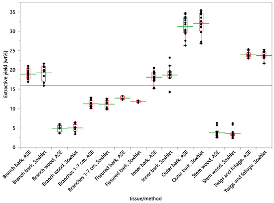 Hence, we had the specific objectives to (a) study the influence of the extraction methods of Soxhlet and accelerated solvent extraction (ASE) on the extractive yield and composition; (b) investigate the influence of stem height on the extractive content and composition; and (c) investigate the extractive content and composition of different stem and branch tissues to create a first comparable data basis for future predictions of larger sample numbers based on one defined solvent system.