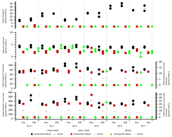 Figure 1 indicates that the used ASE and Soxhlet extractions with the solvent ethyl acetate, ethanol, and water (v:v 4.5:4.5:1) produce similar results, with comparable mean values and variations for the respective tissues. The comparability of the methods is underpinned by single direct comparisons (Table 7), which showed that the extraction yields we obtained for the different tissue with the extractive methods ASE and Soxhlet give the same extractive yields. The exceptions were the inner bark of stem disc 6 (SD6) and the fraction of twigs and foliage (TW) of branch 1 (B1), where a significant difference was found for the two preparation methods, with prob > |t|= 0.0017 and 0.0351, respectively. Additionally, comparing the betulin and lupeol yields after Soxhlet and ASE by tissue and height of the stem showed that the means were similar for all comparisons except for the betulin yields of the inner bark in SD7 (data not shown). Earlier studies on different materials have confirmed the comparability of the methods [50,51]. However, in a study on the extraction of volatile and phenolic compounds from Lamiaceae species, both techniques resulted in satisfying results, although ASE gave significantly higher yields [52]. Our results confirm ASE as a reliable extraction method for comparing the content and composition of extracts from different tissues. When also considering other factors, such as solvent consumption, extraction time, and parameter reproducibility, ASE is preferable to Soxhlet extraction.