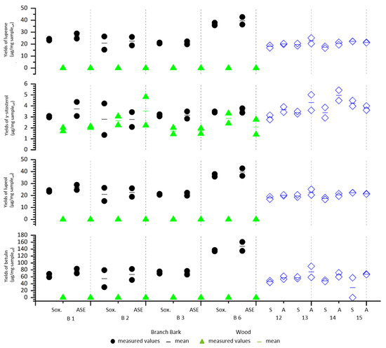 The analysis of the outer bark extractives showed that compounds yielding 600 μg/mg and above were found. In all samples, betulin accounted for more than 60 wt% of the detectable compounds. The obtained results for Soxhlet extraction and ASE are comparable. Krasutsky describes that other triterpenes such as betulinic acid could be found besides betulin and lupeol and confirmed with the results obtained in this study [9]. According to Guo et al., the betulin and lupeol content can increase with higher temperatures and precipitation, but decrease with higher relative humidity when different birch locations are analyzed [53].