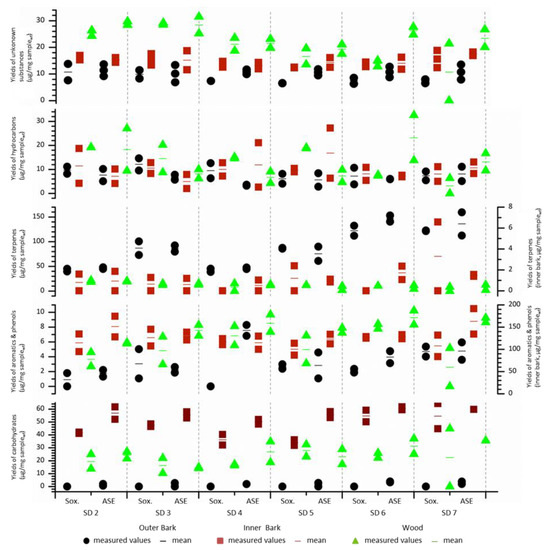 Overview of yields (µg/mg sample mf) of carbohydrates, aromatics/phenolics, terpenes, hydrocarbons, and unknown substances in stem discs of the different tissues extracted with ethyl acetate, ethanol, and water (v:v 4.5:4.5:1) with ASE and Soxhlet (Sox.) (mf—moisture free).