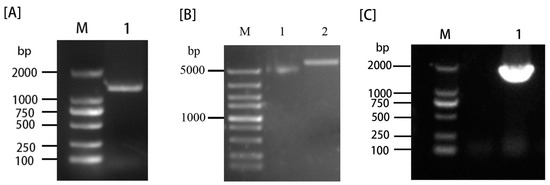 Cloning of the PWN Bxadh2 gene. Note: (A) is PCR amplification of the full length of Bxadh2; (B) is the p ET-32a vector verified by EcoR V single digestion, with (1) showing the p ET-32a vector without restriction endonuclease digestion, and (2) showing the p ET-32a vector with EcoR V single digestion; and (C) is the colony PCR verification.