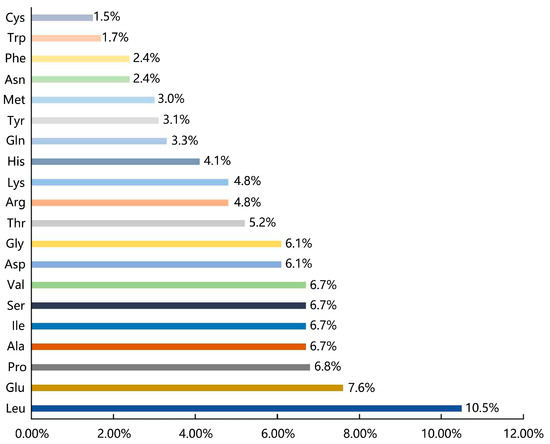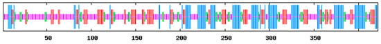 The full CDS length of the PWN Bxadh2 gene was 1269 bp, the NCBI predicted open reading frame (ORF) was 1269 bp long, and the CDS included all complete ORF frames, encoding 422 amino acids. The molecular formula of the protein encoded by the Bxadh2 gene was obtained using the ExPASy-ProtParam tool: C3709H6151N1269O1510S420, with a molecular weight of 45,389.45, a theoretical isopoint (pI) value of 8.87, hydrophilicity of 0.016, and an instability index of 31.09, showing a relatively stable class of proteins. The total number of amino acids was 422, and their distribution is shown in Figure 2.