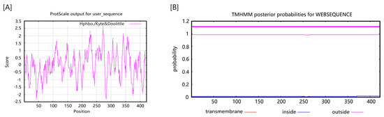 The analysis of the hydrophilicity of the protein encoded by the PWN Bxadh2 gene was conducted using ExPASy-ProtScale. The protein was more hydrophilic near lysine at position 43 and more hydrophobic near isoleucine at position 272 (Figure 3A). Overall, the number of hydrophobic amino acids in the Bxadh2 protein peptide chain was greater than the number of hydrophilic amino acids, indicating that the protein was hydrophobic.