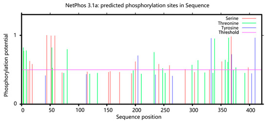 Phosphorylation is one of the most important post-translational modifications in proteins, so the more amino acid phosphorylation sites are present in a polypeptide chain, the more functionality the protein exerts. We predicted the phosphorylation sites of the protein encoded by the PWN Bxadh2 gene online using the NetPhos 3.1 Server. The protein had 14 serine phosphorylation sites, 12 threonine phosphorylation sites and 4 tyrosine phosphorylation sites (Figure 4). The phosphorylation site prediction provides reference sites for future gene expression regulation and protein modification.