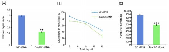 The relative gene expression of each group was calculated based on the 2−ΔΔCT method. The gene expression of the PWNs treated with the NC siRNA solution was compared with those treated with Bxadh2 siRNA. PWN gene expression was found to decrease to 44% after the Bxadh2 siRNA treatment; a Student’s t-test was conducted to analyze the significance of the difference between the two, and significant difference was obtained (Figure 7A), indicating that the interference was effective. Therefore, PWNs treated with RNA interference could be used for subsequent experimental studies.