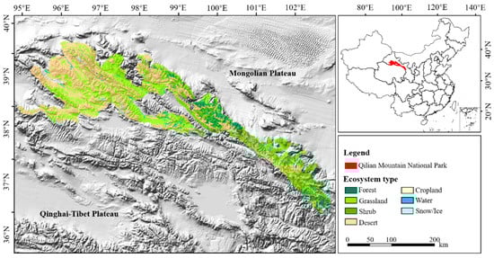 QMNP, with a total area of 5.02 × 104 km2, is one of the first 10 pilot national park systems established in China, renowned for its ecological importance. It serves as an important ecological security barrier in the west, an important water production area for inland rivers and the Yellow River Basin, and a priority area for the conservation of biodiversity. The park (94°51′~103°00′ E, 36°47′~39°48′ N) is located at the intersection of two major plateaus, the Qinghai–Tibet Plateau and Mongolian Plateau. The ecosystem is unique and diverse, with the forest being one of the most critical ecosystem types (Figure 1). It has a typical continental alpine semi-humid mountain climate, with an average annual temperature of approximately 4 °C and an average annual rainfall of approximately 400 mm. The climatic conditions show significant altitude dependence in primary forests, with precipitation increasing and temperature decreasing as altitude increases [26,27,28,29,30].