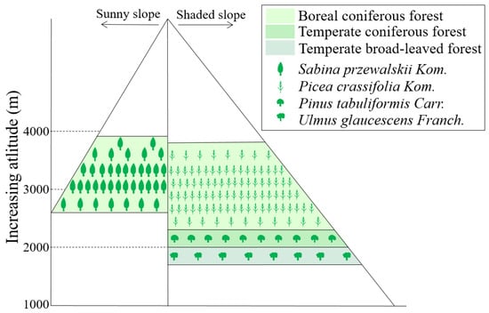 Forest data were obtained from the 30 m land cover dataset and its dynamics from 1990 to 2020 in China (1.0.0) [40]. The dataset was verified based on 5463 visual interpretation samples and the overall accuracy is 80%. The forest information along elevation zones through field investigations is described in Figure 2. The main elevation zone of the forest distribution in QMNP is 2600–3400 m, the lower forest line is 1700 m and the upper forest line is 3900 m [23,26,27]. The main elevation zone of the forest distribution was divided into 400 m intervals. Therefore, the forest distribution of QMNP was divided into four elevation zones: 1700–2600 m, 2600–3000 m, 3000–3400 m, and 3400–3900 m.