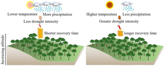 The resilience curves of forests in different elevation zones in this study have the following ecological implications [20,56]: (1) For forests in different elevation zones, the slope of the resilience curve is higher, and the response rate to drought is faster. (2) Forests that withstand greater drought intensity have greater resilience in the same recovery time. If forests in different elevation zones are subjected to the same drought intensity, a shorter recovery time will show greater resilience. (3) By fitting the curve, the recovery time taken for the ecosystem to recover while enduring the corresponding drought intensity can be estimated. (4) The curve provides a basis to measure whether the ecosystem disturbed by continuous drought events can restore during the calculated recovery time; otherwise, the ecosystem may collapse.