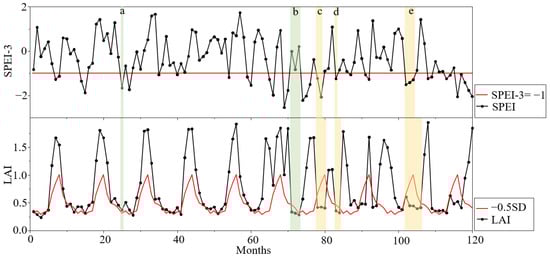 Drought occurrence and recovery time using SPEI-3 and LAI time-series data. a indicates drought occurrence but no LAI anomalies. b indicates LAI anomalies occurrence but no drought. c, d, and e indicate drought and LAI anomalies that occur concomitantly: c represents that recovery time is 3 T; d represents that recovery time is 2 T; and e represents that recovery time is 5 T, T = 1 month.