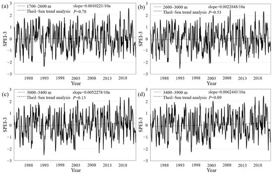 Changes in the SPEI values of forests in different elevation zones of the QMNP from 1982 to 2020. (a), (b), (c), and (d) represent elevation ranges of 1700–2600 m, 2600–3000 m, 3000–3400 m, and 3400–3900 m, respectively.