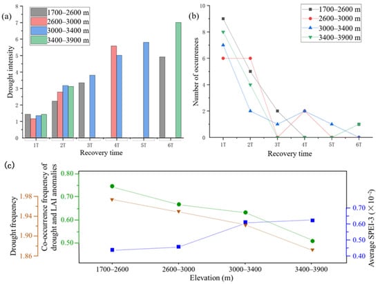 Occurrences of drought and LAI anomaly: (a,b) represent the drought intensity and the total number of drought events in forests of different elevation zones for a given recovery time from 1982 to 2020, respectively, T = 1 month; (c) indicates Mean SPEI-3, the annual average frequency of drought (SPEI-3 < −1), and annual average frequency of the co-occurrence of drought and LAI anomalies in forests of different elevation zones from 1982 to 2020.