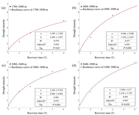 The resilience curves of forests in different elevation zones fitted in this study are shown in Figure 8. The 1700–2600 m and 3000–3400 m resilience curves passed the significance test at the level of 0.05 and 0.01, respectively, while the 2600–3000 m and 3400–3900 m resilience curves only passed the significance test at the level of 0.1 because there were few sample points. From slope b of the resilience curves, the rates of forest resilience in response to drought in the different elevation zones increased in the order 1700–2600 m, 3000–3400 m, 3400–3900 m, and 2600–3000 m. The greater the rate, the more rapid and sensitive response to drought.