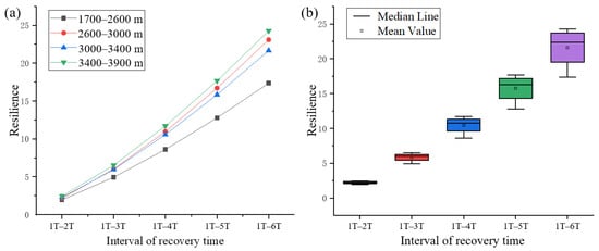 Resilience differentiation, T = 1 month: (a) indicates the difference in resilience values of different elevation zones at each recovery time; (b) indicates the distribution of resilience values in QMNP at each recovery time.