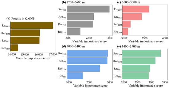 In terms of the occurrence of historical drought events, we explored dominant factors of the temporal differentiation of forest resilience at different altitude zones. The results showed that RecPET was the most important climate factor affecting temporal differentiation of forest resilience in the 1700–3000 m altitude zones (Figure 10b,c). The edf value of one indicated the linear relationship, and greater potential evapotranspiration enhanced resilience (Figure 11b,c and Table 2). RecCLD was the most important climatic factor affecting temporal differentiation of forest resilience in the 3000–3900 m altitude zones (Figure 10d,e). The edf values were 1.81 and 1.32, respectively, indicating that the resilience non-monotonically responded to cloud cover (Figure 11d,e and Table 2). As cloud cover increased, the resilience showed a trend of first increasing and then decreasing. Specifically, forest resilience reached its peak at 24% cloud cover over 3000–3400 m and 33% cloud cover over 3400–3900 m.