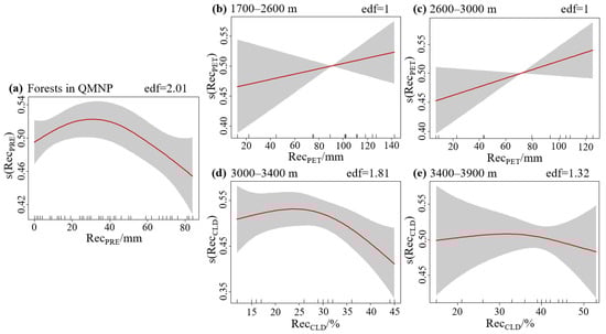RecPRE was the dominant climate factor affecting altitude differentiation of forest resilience in QMNP (Figure 10a). With the estimated degree of freedom (edf) value of 2.01 based on GAM, the resilience non-monotonically responded to RecPRE (Figure 11a and Table 2). As precipitation increased, the resilience showed a trend of first increasing and then decreasing, and reached its peak when the precipitation is 30 mm.