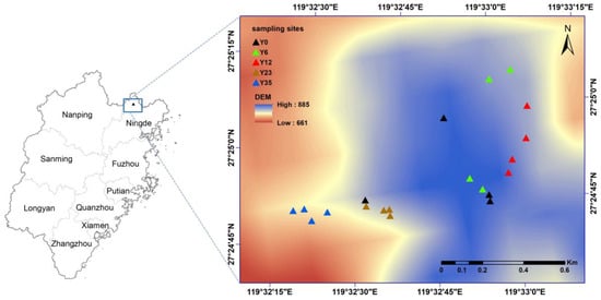 In May 2021, soil samples were collected from the Zhang Tianfu tea fields converted from woodland 6, 12, 23 and 35 years ago (denoted as Y6, Y12, Y23 and Y35, respectively), and an adjacent woodland (Y0) was used as a control. In each tea plantation and woodland, four representative sites were randomly selected from a total area of 2000 m × 4000 m. At each representative site, 3 plots (3 m × 3 m) were randomly selected at 50 m intervals. Five soil cores were collected in each plot, and all subsamples were pooled to form a composite sample for each representative site. Stones and debris were manually removed and then sieved using a 2-mm screen, after which the fresh samples within sterilized plastic bags were shipped to the laboratory. Each sample was subsequently further divided into two parts: one was stored at −80 °C for DNA extraction, and the other was air-dried for soil basic physiochemical analyses.
