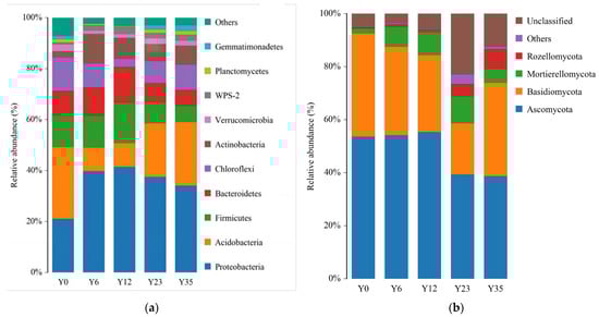 Relative abundance of the bacterial (a) and fungal (b) community at the phylum level (>1%) in the different stages of tea plantation. Y0 represents woodland; Y6, Y12, Y23 and Y35 represent tea planting for 6, 12, 23 and 35 years.