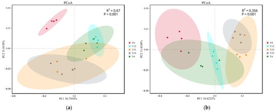 In order to further understand the microbial community differences across the different planting ages of the tea plantations and woodland, PCoA based on OTUs was conducted. The first two PCoA axes accounted for 67.81% and 28.04% of the variation in the bacterial and fungal communities, respectively (Figure 3). PERMANOVA demonstrated that the bacterial (R2 = 0.67, p = 0.001) and fungal (R2 = 0.356, p = 0.001) community compositions were significantly affected by the planting age. The bacterial communities in the woodland were obviously separated from those in tea plantation soil under different planting years, indicating that tea planting had a distinct effect on the soil bacterial community (Figure 3a). Nevertheless, for fungal communities, Y0 and Y6 were closer together (Figure 3b).