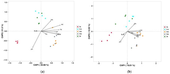 Distance-based redundancy analysis (db-RDA) of soil bacterial (a) and fungal (b) community structure and soil properties. pH: soil pH value; SOM: soil organic matter; TN: soil total nitrogen; TP: soil total phosphorus; TK: soil total potassium; AN: soil available nitrogen; AP: available phosphorus; and AK: available potassium.