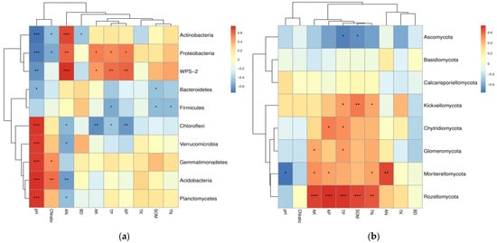 Correlation analyses between the soil environmental factors and the microbial taxa are shown in Figure 5. The bacterial phyla Actinobacteria, Proteobacteria and WPS-2 were significantly and negatively correlated to the soil pH, while positively correlated to AN (Figure 5a). In contrast, Chloroflexi, Verrucomicrobia, Acidobacteria and Planctomycetes showed the opposite trend (Figure 5a). In addition, AK, AP and TP correlated negatively with Chloroflexi but positively with Proteobacteria and WPS-2. In the case of fungi, the most dominant phylum, Ascomycota, was negatively correlated with SOM and TP (Figure 5b); Mortierellomycota was significantly and positively correlated with AN, AP, AK and TN, but negatively correlated with soil pH (Figure 5b). In addition, soil nutrients (SOM, TN, TP, AP and AK) correlated positively with Rozellomycota (Figure 5b).