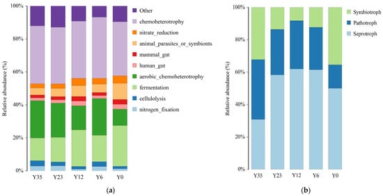 Relative abundances of soil bacterial (top 10) (a) and fungal (b) functional groups in the different stages of tea plantation. Y0 represents woodland; Y6, Y12, Y23 and Y35 represent tea planting for 6, 12, 23 and 35 years.