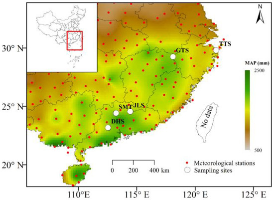Location of study area. White dots indicate the five national nature reserves, including Dinghu Mountain (DHS), Shimentai (SMT), Jiulian Mountain (JLS), Gutian Mountain (GTS), and Tiantong Mountain (TTS); in each reserve, one or two natural S. superba stands were selected for analysis. MAP indicates mean annual precipitation.