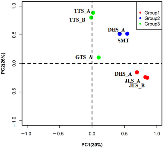 The result of the principal component analysis of eight tree ring-width residual chronologies. Group1, Group2, and Group3 represent the high-elevation stands from the southern subtropical forest, the low-elevation stands from the southern subtropical forest, and stands from the northern subtropical forest, respectively. A and B indicate different stands from five national natural reserves, including Dinghu Mountain (DHS), Shimentai (SMT), and Jiulian Mountain (JLS) in the southern subtropical region, and Gutian Mountain (GTS) and Tiantong Mountain (TTS) in the northern subtropical region.