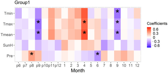 Bootstrapped correlation between the regional chronology and climate of the high-elevation stands in the southern margin (Group 1) from 1988 to 2013. The asterisk indicates a statistical significance of 0.05. The numbers from 1 to 12 indicate months of the current year, while the prefix “p” indicates months of the previous year. Tmin, Tmax, Tmean, SunH, and Pre represent minimum temperature, maximum temperature, mean temperature, Sunshine time, and total precipitation, respectively.
