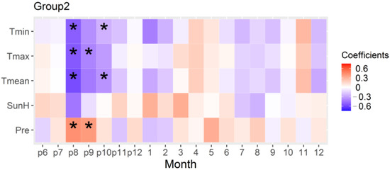 Bootstrapped correlation between the regional chronology and climate of the low-elevation stands in the southern margin (Group 2) from 1988 to 2013. The asterisk indicates a statistical significance of 0.05. The numbers from 1 to 12 indicate months of the current year, while the prefix “p” indicates months of the previous year. Tmin, Tmax, Tmean, SunH, and Pre represent minimum temperature, maximum temperature, mean temperature, Sunshine time, and total precipitation, respectively.
