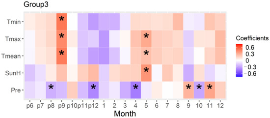 Bootstrapped correlation between the regional chronology and climate of the stands in the northern margin (Group 3) from 1988 to 2013. The asterisk indicates a statistical significance of 0.05. The numbers from 1 to 12 indicate months of the current year, while the prefix “p” indicates months of the previous year. Tmin, Tmax, Tmean, SunH, and Pre represent minimum temperature, maximum temperature, mean temperature, Sunshine time, and total precipitation, respectively.