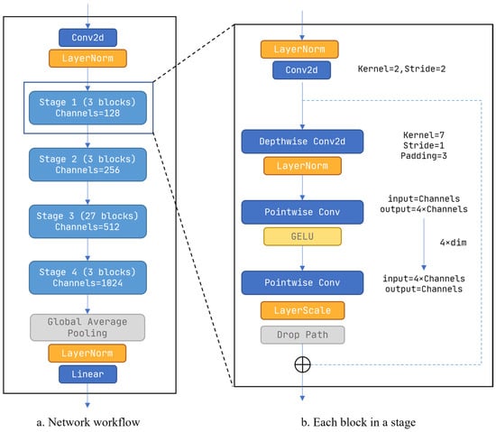 ConvNeXt network architecture (ConvNeXt-B as an example). (a) shows network workflow, while (b) depicts architecture of each block in a stage of network.