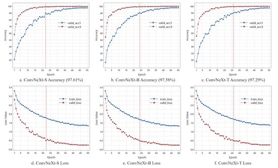 Figure 3d shows that the ConvNeXt-S loss function values changed during training. Due to the small initial learning rate of the warm-up phase, the curve decreased rapidly during the first 10 epochs. When the network first achieved 90% identification accuracy on the validation set, the corresponding loss value was 0.494. It should be noted that the curve did not fluctuate much over a long period after reaching 90% identification accuracy, and the curve eventually stabilized at the 40th epoch. Subsequently, the fluctuation of the loss value curve was almost negligible. Figure 3e,f show that the training processes for the ConvNeXt-B and ConvNeXt-T were, in principle, very similar to those of the ConvNeXt-S. The loss values of the three networks of different depths decreased at basically the same downward trend. However, the deeper network of ConvNeXt-B could fit earlier, and its training process was more stable than those of the other two networks. When the training reached about 40 epochs, the loss function curves of the three networks stabilized and experienced no significant fluctuations.