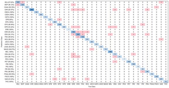 A confusion matrix is a table that shows the extent to which a model predicted the correct class for each test datum, as well as the extent to which it made mistakes. The confusion matrix in Figure 4 shows the average identification accuracy of different tree species on the test set using the pre-trained weights obtained by pre-training the ConvNeXt-S network (without finetune) on the BarkNetV2 dataset. The results demonstrate that ConvNeXt-S achieved high identification accuracy (above 98%) for about half of the tree species. However, the identification accuracy of some tree species was relatively low, with an average accuracy rate of approximately 95%. The tree species with relatively low identification accuracy for ConvNeXt-S were EPR (Acer rubrum), ORA (Ulmus americana), OSV (Ostrya virginiana), and SAB (Abies balsamea). It should be noted that due to the limited number of bark images available for ERB (Acer platanoides), PEG (Populus grandidentata), and PID (Pinus rigida), the pre-trained weights obtained may not apply to the practical classification tasks for these tree species, despite there being no misidentifications of these species in the experiment.
