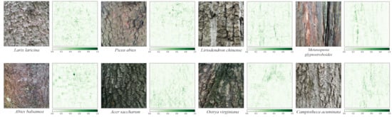 Using deep feature decomposition to perform visualization of category probabilities on four misidentified images, we obtained visualization results similar to those obtained via semantic segmentation (Figure 7). Based on this result, we know which bark image that blocks the network identifies as which tree species. On the bark image of Larix laricina, most areas are identified with the correct label, though there are still a few areas with potential identification errors, i.e., misidentified as CHR (Quercus rubra). The identification precision of Picea abies is relatively higher, with only a tiny portion (one of the lenticel) being misidentified as FRA (Fraxinus americana). Both bark images of Liriodendron chinense and Metasequoia glyptostroboides have relatively noticeable vertical peeling and cracks. Therefore, the decomposition results of these two bark images show a vertical distribution, with only a few misidentification errors appearing on the edge of the bark images, which are misidentified as ERS (Acer saccharum) and CHR (Quercus rubra), respectively. On the bark image of Abies balsamea, only the area in the lower part of the image was correctly identified as SAB, while other areas were identified as EPN (Picea mariana) and CHR (Quercus rubra). The identification results of Acer saccharum are even worse, and the feature decomposition identifies all areas of the image as FRA (Fraxinus americana), indicating that the network’s feature extractor failed to obtain adequate classification information. On the bark image of Ostrya virginiana, there is a large misidentified area in which the tree species is mislabeled as FRA (Fraxinus americana) and ERR (Acer rubrum), in different places. In contrast to the above cases, the mislabeled places on the bark image of Camptotheca acuminata exhibit an extensive vertical distribution, in which the tree species is primarily mislabeled as PSCS (Populus canadensis).