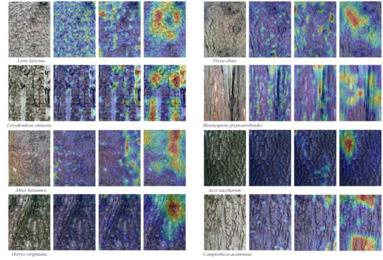 - Kim, T.K.; Hong, J.; Ryu, D.; Kim, S.; Byeon, S.; Huh, W.; Kim, K.; Baek, G.H.; Kim, H.S. Identifying and extracting bark key features of 42 tree species using convolutional neural networks and class activation mapping. Sci. Rep. 2022, 12, 4772. [Google Scholar] [CrossRef] [PubMed]