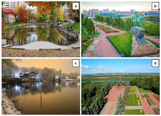 Modern views on the: (a) Garden of culture and recreation named after Sergey Aksakov. Photo source (https://2gis.ru/ufa/gallery/firm/2393065583767068/photoId/30258560056986144 (accessed on 30 March 2023)); (b) Monument to Salavat Yulaev and part of Square named to his honour. Photo source (https://dots-map.com/wp-content/uploads/2022/04/showplace7.jpg (accessed on 30 March 2023)); (c) Park of culture and recreation named after Ivan Yakutov. Photo source (https://oir.mobi/uploads/posts/2019-12/1576102932_1-4.jpg (accessed on 30 March 2023)); (d) Alley and stele to Heroes-soldiers of USSR in the Victory Park. Photo source (https://kakdobratsyado.ru/wp-content/uploads/2018/10/pp2.jpg (accessed on 30 March 2023)).