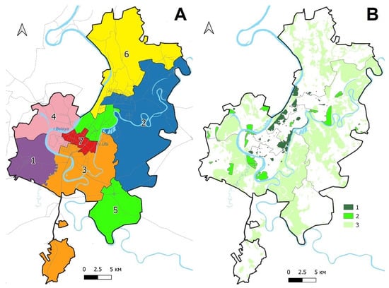 Administrative districts (A) and greenery of Ufa city (B). Map key (A): 1—Dyomsky, 2—Kalininsky, 3—Kirovsky, 4—Leninsky, 5—Oktyabrsky, 6—Ordzhonikidzevsky, 7—Sovetsky. Map key (B): 1—existing public green areas, 2—planned public green areas, 3—other existing green areas.