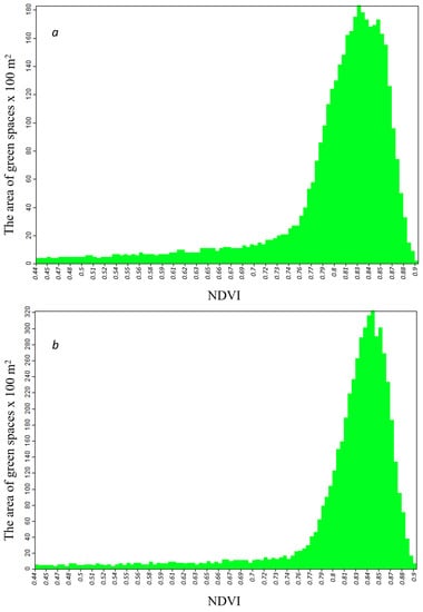 The resulting raster is cropped separately for public green spaces, planned public green spaces, and other green spaces. The SAGA GIS tool (System for Automated Geoscientific Analyses ver. 7.9.1, http://www.saga-gis.org (accessed on 12 March 2023)) was used for creating digital greenery maps and analysing the data. Statistical data for each raster were acquired using the tool “Save Grid Statistics to Table” and a histogram of NDVI value distribution was constructed using the tool “Histogram”.