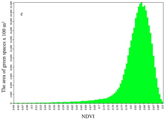 Distribution of NDVI values by greenery type. Map key: (a)—existing public green spaces, (b)—planned public green spaces, and (c)—other existing green spaces.