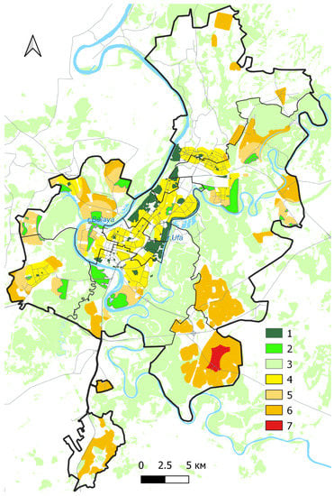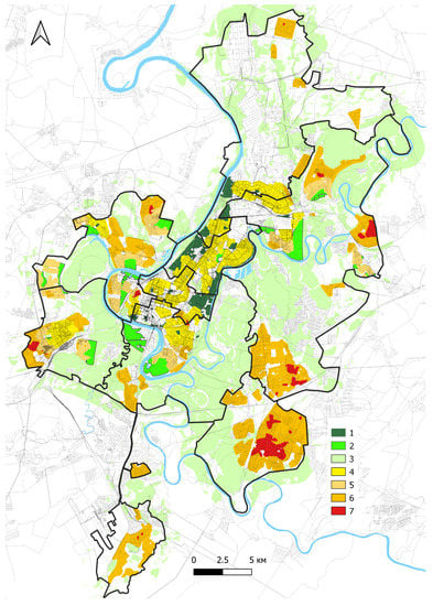 Availability of green spaces within a 15 min walk. Map key: 1—existing public green spaces; 2—planned public green spaces; 3—other existing green spaces. Residential areas with green spaces within a 15 min walk: 4—at the expense of existing public green spaces; 5—at the expense of planned public green spaces; 6—at the expense of other existing green spaces; 7—without green spaces.