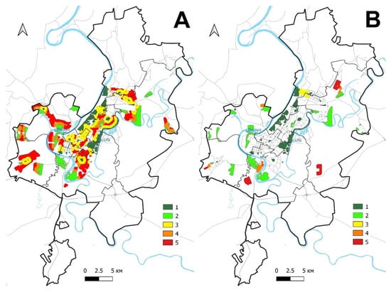 Availability of green spaces: (A)—for residents of multi-storey buildings within a 5 min walk, (B)—for residents of low-rise buildings within a 10 min walk. Map key: 1—existing public green spaces; 2—planned public green spaces.
