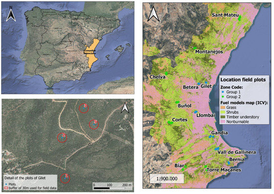 Location of the Valencian region (top left); distribution of plots in the study area and fuel types based on Scott and Burgan models (right) (source: http://agroambient.gva.es/es/web/prevencion-de-incendios/models-de-combustible, accessed 16 December 2022); and a detail of the plots in the Gilet zone code (bottom left), with concentric circles in red representing field collection areas.