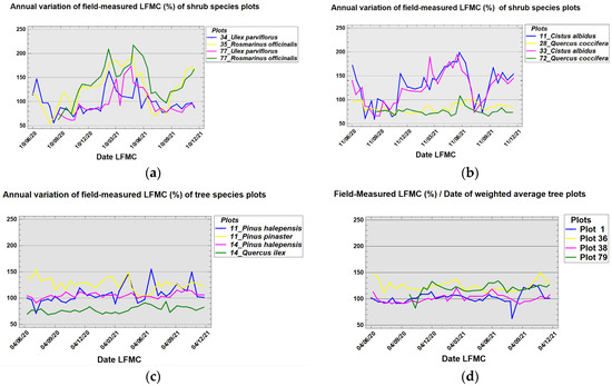 Temporal evolution of the field-observed LFMC of different species in several plots. (a) Shrub species in plots of the thermo-Mediterranean group; (b) shrub species in plots of the meso-Mediterranean group; (c) tree species in plots of the meso-Mediterranean group; (d) LFMC weighted average in tree plots of the thermo-Mediterranean group.