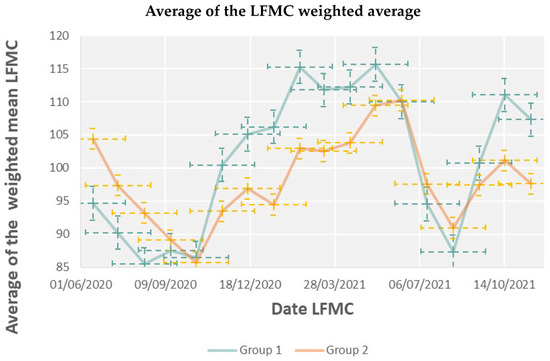 Temporal evolution of field-observed LFMC weighted average for shrub plots of the thermo-Mediterranean (G1) and meso-Mediterranean groups (G2). Field-observed data of several plots were averaged for each field date. Time series were designed based on the monthly average of the LFMC weighted mean, including intervals with standard errors.